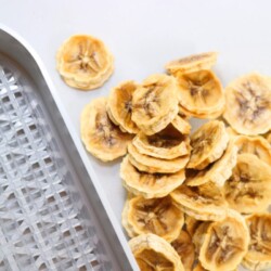 A properly dehydrated banana chip will “click” when dropped on the table, and can be easily snapped in half but not crushed. If yours do not feel this way, just put them back in the dehydrator for a few more hours! A freeze dried dehydrated banana chip, for comparison, will crush to powder under pressure.