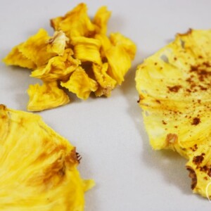 In the first photo, you can see crisp pineapple chips (left), chewy pineapple cube “gummies” (center), and a cinnamon-coated pineapple chip (right). In the second photo you can see pineapple used as a fun garnish for summer or late night drinks!